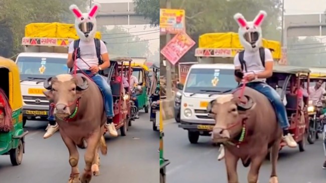 Man Riding Bull on Delhi Busy road after with rabbit theme helmet: सोशल मीडिया पर कुछ दिनों पहले एक वीडियो बड़ा तेजी से वायरल हुआ था, जिसमें एक बाइक सवार शख्स नोए़डा की सड़को पर पिकाचू थीम का हेलमेट पहनकर घूम रहा था। जिसे पुलिस ने पकड़ लिया था हालांकि, शख्स का हेलमेट पुलिस को भी पसंद आया। इस वीडियो को सोशल मीडिया पर बड़ी संख्या में लोगों ने पसंद किया था। अब इसी बीच एक और वीडियो सामने आया है। जिसमें एक युवक पेट्रोल मंहगा होने पर दिल्ली की सड़कों पर बुल की सवारी करता नजर आया। इतना ही नहीं उसने खरगोश की थीम का हेलमेट भी पहन रखा, जिसने लोगों का ध्यान अपनी ओर आकर्षित किया।