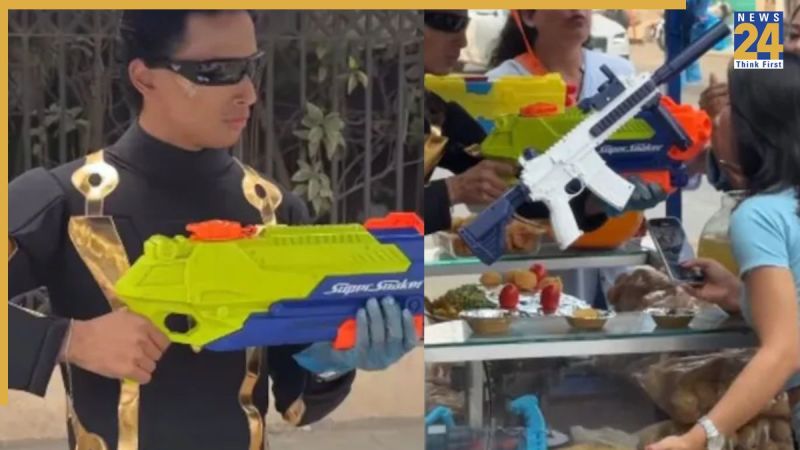 वीडियो में वेंडर डार्क आउटफिट और कॉम्बैट लुक में नजर आता है. वह पहले गोलगप्पों में मसालेदार आलू-चना मिश्रण भरता है, फिर रंगीन सुपर-सोकर वॉटर गन से जलजीरा सीधा पुरी के अंदर ‘टारगेट’ करता है. कुछ शॉट्स में वह ग्राहकों के मुंह में भी स्प्रे करता दिखता है, जिसे देखकर आसपास खड़े लोग हंसते और चीयर करते नजर आते हैं.