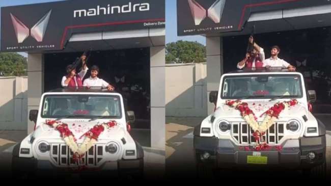 Thar Firing Video: आज के समय में सोशल मीडिया पर न जाने कितने ही वीडियो सामने आते हैं, जो देखते ही देखते वायरल हो जाते हैं। अपने इमोशन और सपनों को भी लोग सोशल मीडिया पर शेयर करते हैं। लेकिन कई बार शौक-शौक में लोग गलत काम भी कर बैठते हैं। जिनको बाद में पछतावा होता है। एक वीडियो सोशल मीडिया पर वायरल हो रहा है। जिसमें एक शख्स थार गाड़ी खरीदने के बाद इतना खुश होता है कि वह शोरूम के बाहर ही इस पर चढ़कर फायरिंग करने लगता है। इस व्यक्ति ने जोश में यह कारनामा कर दिया। बताया जा रहा है कि ये मामला मध्य प्रदेश का है। सोशल मीडिया में वायरल वीडियो पर लोगों की तीखी प्रतिक्रियाएं आ रही हैं।