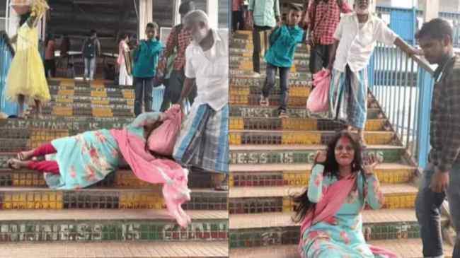 рд╡рд╛рдпрд░рд▓ рд╡реАрдбрд┐рдпреЛ рдореЗрдВ рджрд┐рдЦрд╛рдИ рджреЗ рд░рд╣рд╛ рд╣реИ рдХрд┐ рдПрдХ рд▓реЬрдХреА рд░реЗрд▓рд╡реЗ рд╕реНрдЯреЗрд╢рди рдХреА рд╕реАреЭрд┐рдпреЛрдВ рд╕реЗ рдЧрд┐рд░рдиреЗ рдХреА рдиреМрдЯрдВрдХреА рдХрд░ рд░рд╣реА рд╣реИред рд╡рд╣ рдПрдХ рдмреБрдЬреБрд░реНрдЧ рдХреЗ рдмрдЧрд▓ рдореЗрдВ рдЧрд┐рд░рдиреЗ рдХрд╛ рдирд╛рдЯрдХ рдХрд░рддреА рд╣реИ рдФрд░ рд╕реАреЭрд┐рдпреЛрдВ рд╕реЗ рд▓реБреЭрдХрддреЗ рд╣реБрдП рдиреАрдЪреЗ рдХреА рддрд░рдл рдЖрдиреЗ рд▓рдЧрддреА рд╣реИ, рдЬрдм рд▓реЬрдХреА рдмреБрдЬреБрд░реНрдЧ рдХреЗ рдкрд╛рд╕ рдкрд╣реБрдВрдЪреА рддреЛ рд▓реЛрдЧ рд╡рд╣ рдорджрдж рдХреЗ рд▓рд┐рдП рд╣рд╛рде рдмреЭрд╛рдпрд╛ред