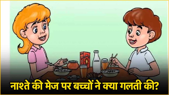 Puzzle: जैसा कि आप नीचे दी गई तस्वीर में देख सकते हैं, दो बच्चे नाश्ता कर रहे हैं। उनकी डाइनिंग टेबल पर दूध, ब्रेड, संतरे का जूस, चोको चिप्स, पनीर जैसे कई Food ingredient नजर आ रहे हैं। ऊपर दी गई तस्वीर बहुत ही परफेक्ट लग रही है। लेकिन सच कहें तो इस तस्वीर में बहुत बड़ी गड़बड़ है। तो यहां तरकीब हैं, यदि आपकी नजर तेज है, तो इन नाश्ता करने वाले लड़के की गई गलती को 5 सेकंड में पहचान लें।