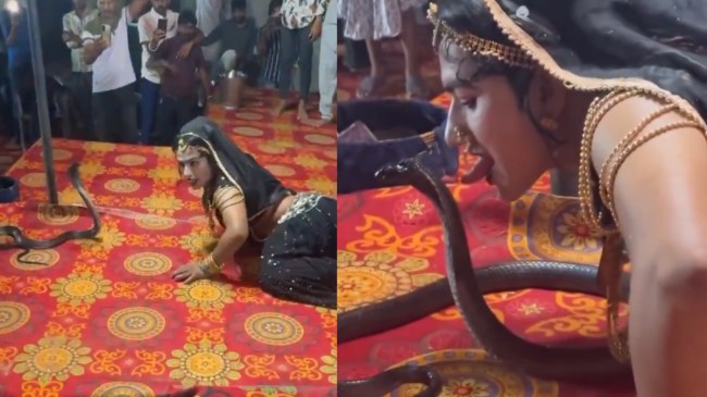 рд╡реАрдбрд┐рдпреЛ рдореЗрдВ рд╕реНрдЯреЗрдЬ рдкрд░ рдПрдХ рд▓реЬрдХреА рдбрд╛рдВрд╕ рдХрд░ рд░рд╣реА рд╣реИред рдРрд╕рд╛ рдкреНрд░рддреАрдд рд╣реЛ рд░рд╣рд╛ рд╣реИ рдХрд┐ рд╡рд╣ рдирд╛рдЧрд┐рди рдмрдиреА рд╣реБрдИ рд╣реИ рд▓реЗрдХрд┐рди рд╕рд╛рдордиреЗ рдХреЛрдИ рд╕рдкреЗрд░рд╛ рдирд╣реАрдВ рдмрд▓реНрдХрд┐ рдЕрд╕рд▓ рдореЗрдВ рдПрдХ рдирд╛рдЧ рд╣реИред рдпреЗ рдирд╛рдЧ рдирдХрд▓реА рдирд╣реАрдВ рдмрд▓реНрдХрд┐ рдЕрд╕рд▓реА рдХреЛрдмрд░рд╛ рд╕рд╛рдВрдк рд╣реИред рдирд╛рдЧ рдЕрдкрдирд╛ рдлрди рдирд┐рдХрд╛рд▓рдХрд░ рдмреИрдард╛ рд╣реБрдЖ рд╣реИ рдФрд░ рд▓реЬрдХреА рдЙрд╕рдХреЗ рд╕рд╛рдордиреЗ рдбрд╛рдВрд╕ рдХрд░ рд░рд╣реА рд╣реИред