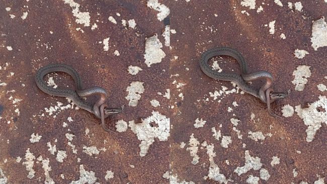 सोशल मीडिया प्लेटफॉर्म X पर एक यूजर ने लिखा सांप की दो फोटो शेयर की है। इस फोटो में एक सांप खुद से ही लिपटा हुआ दिखाई दे रहा है। सांप अपनी पूंछ से अपने ही मुंह को जकड़ा हुआ है। फोटो शेयर कर दावा किया जा रहा है कि ये सांप खुद का गला घोंट रहा था, 10 मिनट बाद वह मर गया। अब लोगों का कहना है कि ये जानवर और सांप कब से सुसाइड करने लगे।