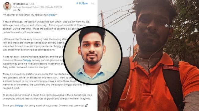 Linkedin Post Viral Swiggy Delivery Partner : लिंक्डइन पर सॉफ्टवेयर डेवलपर की पोस्ट खूब वायरल हो रही है। इसमें सॉफ्टवेयर डेवलपर ने बताया है कि कैसे उनकी नौकरी जाने के बाद बुरे दिन शुरू हो गए थे लेकिन स्विगी की वजह से उन्हें स्थिति संभालने में मदद मिली और अब वह स्विगी को अलविदा कहकर नई नौकरी ज्वाइन करने जा रहे हैं। लिंक्डइन यूजर रियाजुद्दीन एक सॉफ्टवेयर डेवलपर हैं, उन्होंने बताया कि नौकरी जाने के बाद वह डिलीवरी एजेंट बन गए थे।