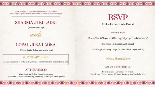 इसके अलावा पोस्ट में आपको रिसेप्शन का भी इनवाइट मिल जाएगा, जिसको खास बुआ और फूफा जी के कलेश के लिए रखा गया है। कार्ड की शुरुआत में लिखा है, ‘शादी हो गई , अब बारी है बुआ और फूफा जी के कलेश की! दूसरी लाइन में रिसेप्शन को हाइलाइट करके लिखा गया है कि शादी का हैंगओवर अभी खत्म नहीं हुआ, रिसेप्शन का ड्रामा देखने जरूर आएं।