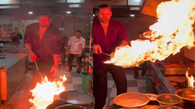 जैसे ही वह खाना पकाने के लिए गर्म हुए पैन में थोड़ा-सा तेल डालते हैं तो आग की ऊंची लपटें उठने लगी हैं। यह देखकर खली एकदम पीछे हटते हैं और फिर हाथ में पकड़े पैन को अचानक छोड़ देते हैं, जिससे वह नीचे गिर जाता है। इसके बाद उत्साहित होते हुए वे कहते हैं कि वाह… यह वीडियो उनकी उनकी टीम ने इंस्टाग्राम पर अपलोड किया।
