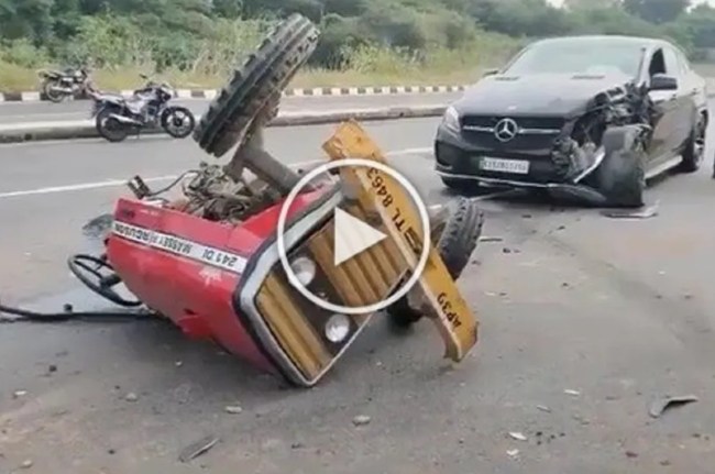 घटना का वीडियो सोशल मीडिया पर वायरल हो गया है। रिपोर्ट्स के मुताबिक, विपरीत दिशा से आ रहा ट्रैक्टर अचानक मर्सिडीज बेंज कार से टकरा गया। वायरल वीडियो में दिख रहा है कि ट्रैक्टर की टक्कर के बाद मर्सिडीज बेंज कार के बोनट का एक हिस्सा क्षतिग्रस्त हो गया जबकि ट्रैक्टर दो टुकड़ों में बंट गया।