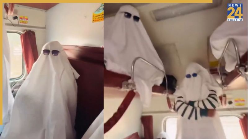 वीडियो में दिखता है कि ट्रेन चल रही है और एक यात्री सिर से पैर तक सफेद चादर ओढ़कर लेटा हुआ है. उसने काला चश्मा भी पहन रखा है, जिससे वह किसी “भूत” जैसा लग रहा है. जब कैमरा दूसरी तरफ जाता है तो वहां भी कई यात्री इसी अंदाज में चादर ओढ़े बैठे नजर आते हैं. उनका लुक इतना अजीब है कि अगर कोई रात में उन्हें देख ले, तो सच में डर सकता है.