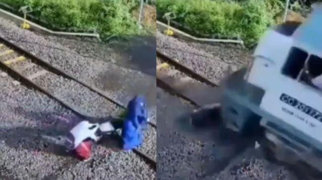 वायरल वीडियो में दिखाई दे रहा है कि एक स्कूटी पर दो महिलाएं एक बच्चे के साथ सवार हैं और रेलवे ट्रैक को पार करने की कोशिश कर रही हैं। बीच ट्रैक पर स्कूटी का पहिया फंस गया। लड़की ने स्कूटी को निकालने की पूरी कोशिश की लेकिन कोई सफलता नहीं मिली। पीछे बैठी महिला उतर गई और स्कूटी को धक्का देने लगी लेकिन कोई फायदा नहीं हुआ। इसी दौरान ट्रेन आ गई।