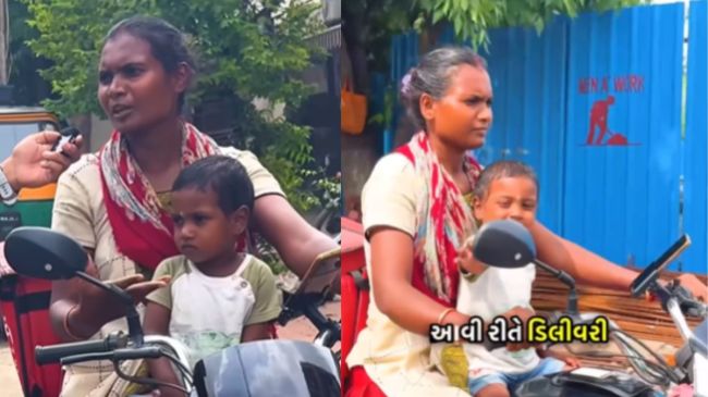 इंस्टाग्राम पर एक महिला डिलीवरी पार्टनर का वीडियो वायरल हो रहा है, जिसमें वह बाइक चला रही है और उसके सामने उसका छोटा बच्चा बैठा हुआ है। ये वीडियो गुजरात के राजकोट का है, जिसे विशाल नाम के एक कंटेंट क्रिएटर ने इंस्टाग्राम पर शेयर किया। वीडियो में विशाल ने बताया है कि महिला रेस्टोरेंट से पार्सल उठाकर कस्टमर्स को डिलीवर करती है।