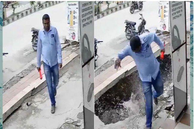 वीडियो में आदमी आराम से एक दुकान की ओर जा रहा है। हालांकि, कुछ क्षण बाद, जैसे ही वह कंक्रीट की सतह पर चलता है, वह अचानक नीचे के नाले में गिर जाती है। अंत में, शख्स की हैरानी ये दिखाने में काफी थी कि कैसे उसकी जान बची। घटना किस स्थान पर हुई इसका अभी पता नहीं चल पाया है।