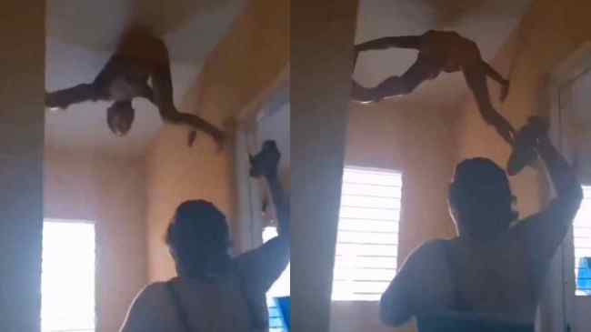 वीडियो में देखा जा सकता है कि एक बच्चा स्पाइडर मैन बनकर सीलिंग तक चढ़ गया है, नीचे एक महिला हाथ में चप्पल लेकर खड़ी है। जैसे ही बच्चा थोड़ा सा नीचे आता है महिला चप्पलों से पिटाई शुरू कर देती है। इसके बाद बच्चा फिर सीलिंग की तरफ चढ़ जाता है। यह खेल काफी देर तक चलता रहा।