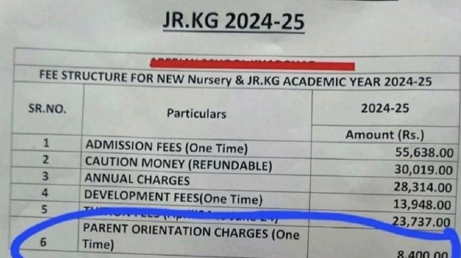 नर्सरी स्कूल की चौंका देने वाली फीस देखने के बाद लोग हैरान हैं। फीस के डिटेल में बताया गया कि पैरेंट्स ओरिएंटेशन की फीस 8,400 रुपये हैं। इसके साथ ही साथ नर्सरी और जूनियर केजी छात्रों के लिए ₹ 55,600 की एडमिशन फीस शामिल है। फीस की कॉपी सोशल मीडिया पर वायरल हो रही है।