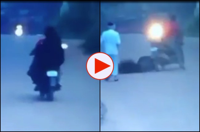 इस वीडियो में बुर्का पहने एक महिला को बाइक की पिछली सीट पर बैठे देखा जा सकता है। लेकिन कुछ दूर जाकर इस महिला का बुर्का पहिए में फंस जाता है। ऐसा होते ही वह महिला बुरी तरह से बाइक से नीचे गिर जाती है। हादसे के तुरंत बाद ही बाइक भी वहीं की वहीं थमकर महिला के ऊपर गिर जाती है।