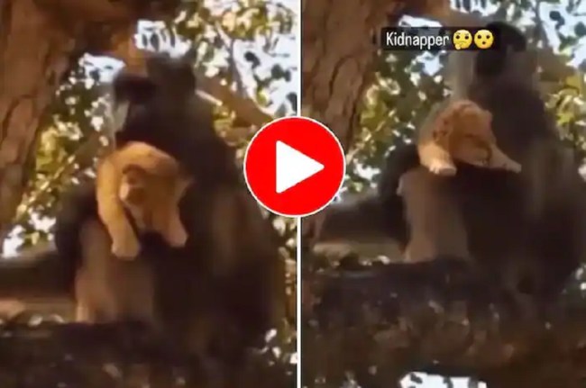рдПрдХ рд▓рдВрдЧреВрд░ рдиреЗ рд╢реЗрд░ рдХреЗ рдмрдЪреНрдЪреЗ рдХреЛ рдкрдХрдбрд╝ рд░рдЦрд╛ рд╣реИ рдФрд░ рд╡рд╣ рдкреЗрдбрд╝ рдкрд░ рдмреИрдард╛ рд╣реБрдЖ рд╣реИред рд╡реАрдбрд┐рдпреЛ рдореЗрдВ рджреЗрдЦрд╛ рдЬрд╛ рд╕рдХрддрд╛ рд╣реИ рдХрд┐ рдПрдХ рдФрд░ рд▓рдВрдЧреВрд░ рдХреЛ рджреЗрдЦрд╛ рдЬрд╛ рд╕рдХрддрд╛ рд╣реИред рд╣рд╛рд▓рд╛рдВрдХрд┐, рд╡рд╣ рд▓рдВрдЧреВрд░ рдмрдЪреНрдЪреЗ рдХреЛ рд▓реЗрдХрд░ рдиреАрдЪреЗ рдЖ рдЬрд╛рддрд╛ рд╣реИред рд╡реАрдбрд┐рдпреЛ рдЬреНрдпрд╛рджрд╛ рд╕рд╛рдл рдирд╣реАрдВ рд╣реИ, рд▓реЗрдХрд┐рди рдЕрдВрдд рдореЗрдВ рджреЗрдЦрдиреЗ рдХреЛ рдорд┐рд▓рддрд╛ рд╣реИ рдХрд┐ рд╢реЗрд░ рдЬреИрд╕реЗ рд▓рдВрдЧреВрд░ рдХрд╛ рд╣реА рдЗрдВрддрдЬрд╛рд░ рдХрд░ рд░рд╣рд╛ рдерд╛ рдХрд┐ рдХрдм рдЬреЛ рдиреАрдЪреЗ рдЖрдП рдФрд░ рд╡рд╣ рдЙрд╕рдкрд░ рд╣рдорд▓рд╛ рдХрд░реЗред