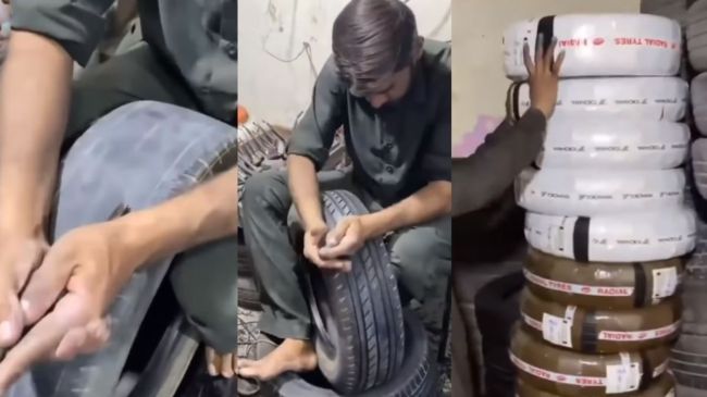 рд╡реАрдбрд┐рдпреЛ рдореЗрдВ рдПрдХ рд╢рдЦреНрд╕ рдкреБрд░рд╛рдиреЗ рдШрд┐рд╕реЗ рд╣реБрдП рдЯрд╛рдпрд░ рдХреЛ рдирдП рдЬреИрд╕рд╛ рдмрдирд╛ рд░рд╣рд╛ рд╣реИред рд╡рд╣ рдШрд┐рд╕ рдЪреБрдХреЗ рдЯрд╛рдпрд░ рдореЗрдВ рдПрдХ рдФрдЬрд╛рд░ рд╕реЗ рдХрдЯ рд▓рдЧрд╛ рд░рд╣рд╛ рд╣реИ рдФрд░ рдлрд┐рд░ рдЙрд╕реЗ рд╕рд╛рдл рдХрд░ рдПрдХрджрдо рдирдП рдЬреИрд╕рд╛ рдмрдирд╛ рджрд┐рдпрд╛ред рдЗрд╕рдХреЗ рдмрд╛рдж рдЙрд╕реЗ рдПрдХ рдкреНрд▓рд╛рд╕реНрдЯрд┐рдХ рд╕реЗ рдкреИрдХ рдХрд░ рд▓реЗрдмрд▓ рд▓рдЧрд╛ рджрд┐рдпрд╛ред рдкреИрдХ рд╣реЛрдиреЗ рдХреЗ рдмрд╛рдж рдпрд╣ рдкрддрд╛ рдХрд░ рдкрд╛рдирд╛ рдореБрд╢реНрдХрд┐рд▓ рд╣реИ рдХрд┐ рдпреЗ рдЯрд╛рдпрд░ рдирдпрд╛ рд╣реИ рдпрд╛ рдкреБрд░рд╛рдирд╛ред