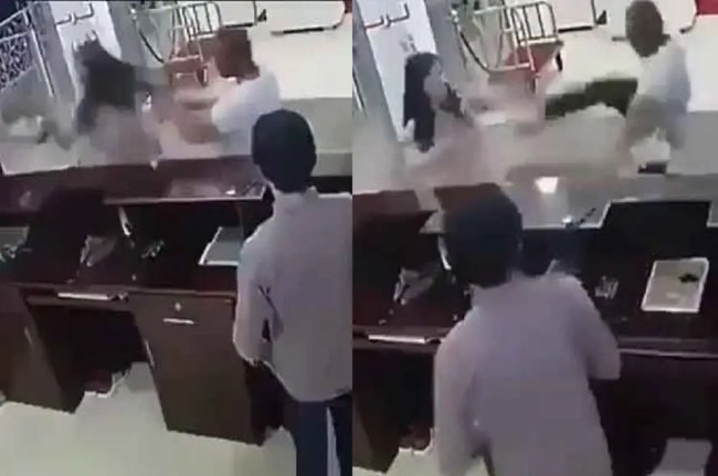 वीडियो में दिख रहा है कि युवक लड़की के साथ एक काउंटर पर खड़ा है। अचानक युवक ने किसी कारणवश लड़की को पीछे धकेल दिया। तुरंत, लड़की हरकत में आ जाती है और अपना पैर उठाती है, जबकि युवक हाथ उठाता है।