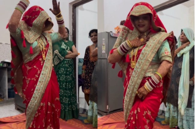 वीडियो एक कमरे का है। कमरे में नई दुल्हन लाल रंग की साड़ी पहनें हुए डांस करती दिख रही है। आसपास औरतें उसके डांस को देख रही हैं। कुछ उस पर पैसे वार रहीं हैं। डांस कर रही दुल्हन ने गले में मंगलसूत्र और सोने का बड़ा सा हार पहना हुआ है। हाथ में चूड़ा डाले हुए हैं।