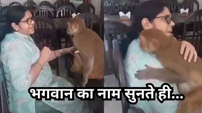 Monkey Viral Video : दुनिया में एक से बढ़कर एक चमत्कार होते रहते हैं। कुछ तो ऐसे होते हैं जिन्हें सुनकर या देखकर यकीन करना मुश्किल हो जाता है। धर्म से जुड़े मामले तो और चमत्कारिक होते हैं। इस वक्त एक वीडियो सोशल मीडिया पर वायरल हो रहा है जिसमें एक बंदर महिला से जब पहली बार मिला तो गले लग गया। महिला भजन गाती रही और बंदर महिला से चिपका रहा।