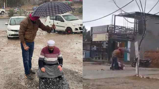 Jammu Kashmir : जम्मू कश्मीर का एक वीडियो सोशल मीडिया पर वायरल हो रहा है। वीडियो में दिखाई दे रहा है कि आसमान से ओले गिर रहे हैं और एक शख्स खुली जगह पर नमाज पढ़ रहा है। गाड़ी से जा रहे एक शख्स ने इस घटना को देखा तो वह छाता लेकर पहुँच गया और नमाज पढ़ रहे शख्स को भीगने और ओले की चोट से बचाया। सोशल मीडिया पर यह वीडियो वायरल हो रहा है।