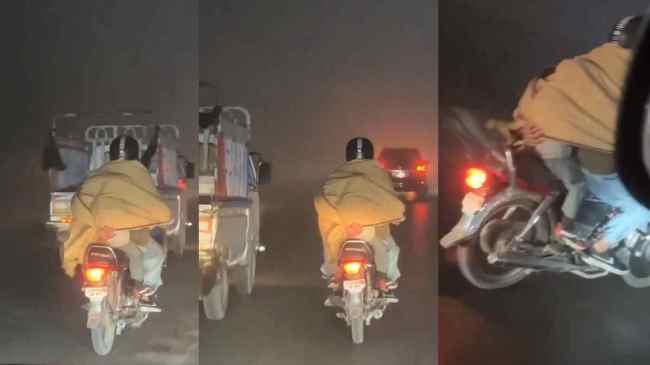 рд╡реАрдбрд┐рдпреЛ рд░рд╛рдд рдХреЗ рд╡рдХреНрдд рдХрд╛ рд╣реИ, рдЬрдмрд░рджрд╕реНрдд рдХреЛрд╣рд░рд╛ рджрд┐рдЦрд╛рдИ рджреЗ рд░рд╣рд╛ рд╣реИред рд╕реЬрдХ рдкрд░ рджреМреЬ рд░рд╣реАрдВ рдХрд╛рд░реЛрдВ рдХреЗ рдмреАрдЪ рдПрдХ рд╢рдЦреНрд╕ рдмрд╛рдЗрдХ рдкрд░ рдмрдЪреНрдЪреЗ рдХреЗ рд╕рд╛рде рдЬрд╛ рд░рд╣рд╛ рд╣реИред рдмрдЪреНрдЪрд╛ рдкреАрдЫреЗ рдмреИрдард╛ рд╣реБрдЖ рд╣реИ рдФрд░ рдмрд╛рдЗрдХ рдЪрд▓рд╛ рд░рд╣рд╛ рд╢рдЦреНрд╕ рдПрдХ рд╣рд╛рде рд╕реЗ рдмрд╛рдЗрдХ рдЪрд▓рд╛ рд░рд╣рд╛ рд╣реИ рдЬрдмрдХрд┐ рджреВрд╕рд░реЗ рд╣рд╛рде рд╕реЗ рдЙрд╕рдиреЗ рдмрдЪреНрдЪреЗ рдХреЛ рдкрдХреЬрд╛ рд╣реБрдЖ рд╣реИред рдЗрддрдирд╛ рд╣реА рдирд╣реАрдВ, рд╢рдЦреНрд╕ рдПрдХ рд╢реЙрд▓ рд╕реЗ рдЦреБрдж рдФрд░ рдмрдЪреНрдЪреЗ рдХреЛ рдврдХрд╛ рд╣реБрдЖ рд╣реИ рдЬрд┐рд╕рд╕реЗ рдардВрдб рдирд╛ рд▓рдЧреЗред
