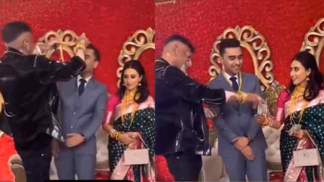 वीडियो में, शादी के बाद रिसेप्शन में एक कपल स्टेज पर खड़ा है, तभी एक रिश्तेदार वहां पहुंचा और दूल्हे को एक सोने की चेन पहना दी। ये देखकर सब हैरान रह गए। खुद दुल्हन भी हैरत भरी नजरों से देखने लगी। इसके बाद इस शख्स ने अपनी जेब नोटों की गड्डी निकाली और एक एक नोट दुल्हन को देने लगा।