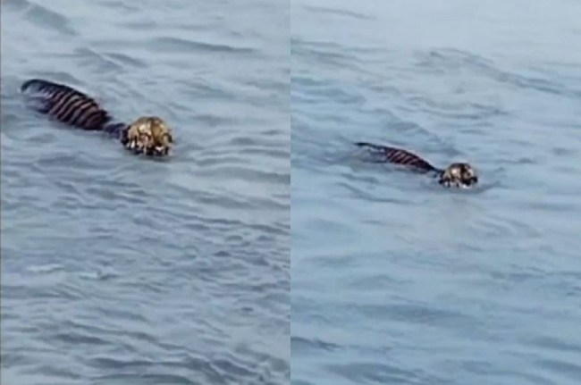 A tiger was seen swimming at Umananda today morning @guwahaticity pic.twitter.com/OW8M0EkDI5