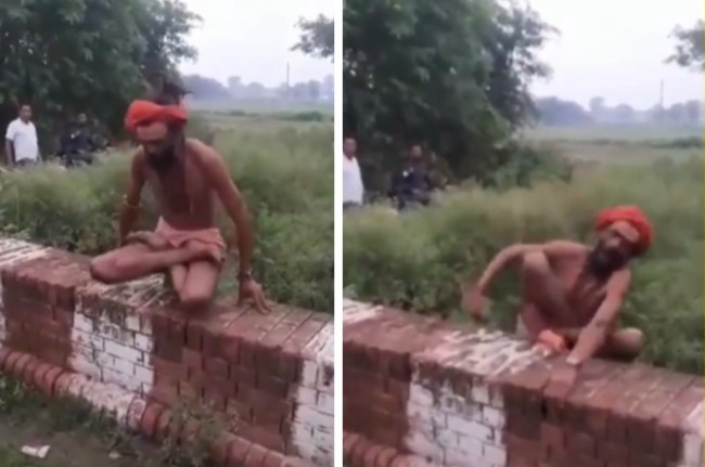 संतुलन बिगड़ते ही वह नहर में पीछे की ओर पानी में जा गिरता है। हालांकि नहर में पानी कम ही था। साधु को किसी भी प्रकार की चोट नहीं आई है। वहां खड़ा एक व्यक्ति अपने कैमरे से इस पूरे वाक्ये को कैद कर रहा था। साधु के गिरते ही वहां खड़े लोगों की हंसी छूट जाती है।