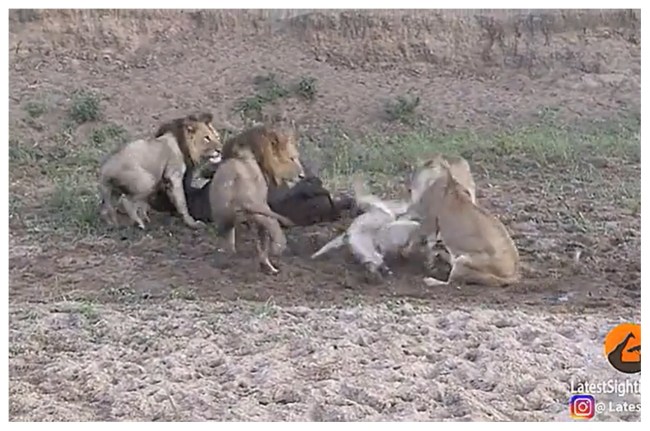इस Viral Video में एक भैंस जमीन पर धराशायी पड़ी है। तीन शेरनियों व दो शेरों के समूह ने उसे घेर रखा है और हमला बोलते हुए उसे खाना शुरू कर रहें हैं। अभी शेरों के इस हमले से भैंस की धड़कनें बंद होती इससे पहले एक शेरनी को दूसरे का भैंस को नोंचना नहीं भाया।