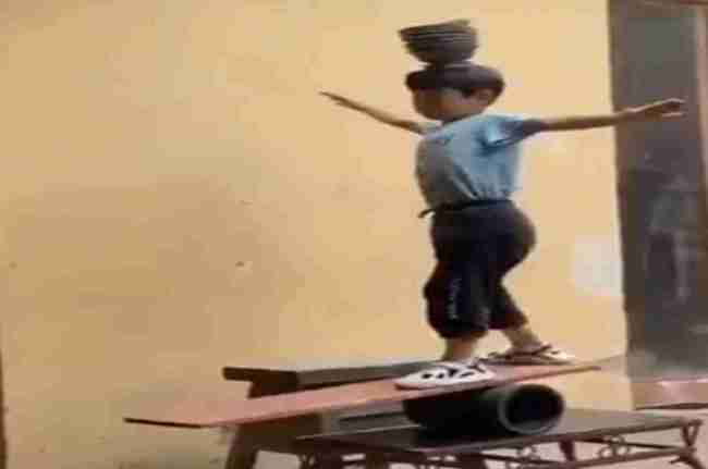 इस वीडियो में एक बच्चा नजर आ रहा है जो ऐसा काम कर रहा है जिसे देख लोगों की आंखें फटी रह जा रही है। बता दें, वीडियो में छोटा सा बच्चा एक लकड़ी के तख्त पर खड़ा है और बैलेंस बनाने की कोशिश कर रहा है। तख्त को एक गोल से बेलन के आकार वाले चीज पर रखा हुआ है जिसकी वजह से वो आगे-पीछे हो रहा है। वहीं तख्त पर कुछ कटोरे रखे हुए हैं जिसे वो बिना हाथ की मदद के अपने सिर पर रख रहा है।