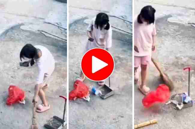 वायरल हो रहे इस वीडियो में एक लड़की नजर आ रही है जो सड़क पर झाड़ू लगाते नजर आ रही है। लेकिन झाड़ू लगाने से ज्यादा ध्यान उसका फोन पर है। झाड़ू लगाते-लगाते वो फोन का इस्तेमाल कर रही है। उसके बाद वो कूड़ा उठाने के लिए झाड़ू को अपने हाथ के बगल में दबा लेती है और कूड़ा उठाने लगती है। लेकिन जब वो फिर से झाड़ू लगाने के लिए झाड़ू लेना चाहती है तो उसके ध्यान ही नहीं रहता कि झाड़ू कहा है। जबकि झाड़ू उसके हाथ के बगल में ही रहता है।