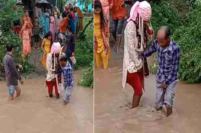 वायरल हो रहे वीडियो में देख सकते हैं कि एक दूल्हा अपने पूरे परिवार के साथ बाढ़ में ही शादी करने के लिए निकल पड़ा। वह अकेले नहीं था उसके साथ कई सारे लोग थे। दूल्हे ने शेरवानी पहनी, सिर पर सेहरा लगाया और फिर एक शख्स की मदद से बाढ़ के पानी में घुस गया। हालांकि, उसने जमीन पर लटक रहे कपड़ों को एक हाथ से पकड़ लिया और धीमे-धीमे पार करने की कोशिश करने लगा। उसके पीछे-पीछे परिवार की महिलाएं भी निकलने लगी। शादी के दिन दूल्हे के अंदर ऐसा जुनून देखकर लोग भी जमकर वाहवाही करने लगे।
