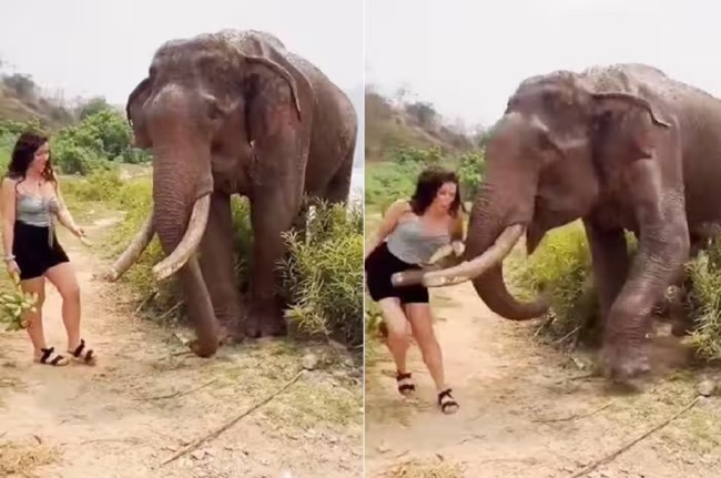 कभी-कभी देखने को मिलता है कि जानवर बेहद आक्रामक हो जाते हैं, विशेष रूप से जब ऐसी स्थितियां होती हैं जब वे मनुष्यों द्वारा छेड़े या चिढ़ जाते हैं। यह अब वायरल हो रहे वीडियो में दिखता है। एक हाथ में केले का गुच्छा लिए महिला एक विशाल हाथी को लुभा रही है जैसे कि वह चाह रही हो शक्तिशाली जंबो को उसकी आज्ञा का पालन करे। टस्कर कुछ कदमों तक उसका पीछा करता है और उसके बाद, वह कुछ बहुत खतरनाक करने वाला होता है। हाथी युवती को उठाकर पटक देता है, जो शायद बहुत ही दर्दनाक रहा होगा।