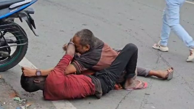 दोनों शख्स नशे में एक दूसरे को मारने की कोशिश कर रहे हैं। काफी देर तक उनके बीच मारपीट चलती रही। कुछ लोग लड़ाई का वीडियो रिकॉर्ड करते हैं तो कुछ इसे देखकर हंसते हुए वहां से निकल गए लेकिन कोई इन नशेड़ियों को वहां से भगाने नहीं आया।