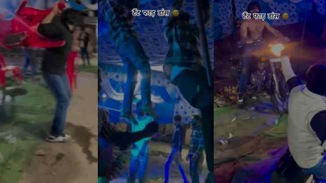 वीडियो में दिखाई दे रहा है कि डांस में सिर्फ पुरुष ही शामिल हैं। सभी शादी का जश्न मनाते हुए इतने जोश में आ गए कि कोई नाचते-नाचते बर्तन फेंक रहा है, कोई खंभों पर चढ़कर और कुछ तो शर्टलेस होकर नाचते दिखाई दे रहे हैं। कुछ लोग कुर्सियां फेंक रहे हैं तो कुछ टेंट के कपड़े फाड़ रहे हैं।
