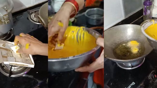वायरल वीडियो में एक महिला कढ़ाई में तेल गर्म करती दिखाई दे रही है। पास में काजू कतली का डिब्बा रखा हुआ है। महिला से जब पूछा गया कि वह क्या बना रही है तो उसने बताया कि काजू कतली के पकौड़े! महिला ने काजू कतली के पकौड़े बनाकर लोगों को हैरान कर दिया।