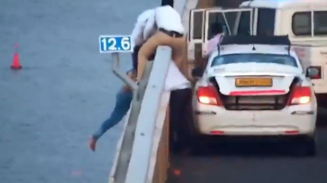वीडियो में देखा जा सकता है कि महिला अटल सेतु पर बनी रेलिंग को पार कर बैठी हुई है। पास में ही एक कैब खड़ी है और उसका ड्राइवर महिला के पास खड़ा है। कुछ ही सेकंड बाद महिला ने समुद्र में कुछ फेंकती है और खुद भी कूद गई। जैसे ही महिला ने छलांग लगाई, कैब ड्राइवर ने उसके पकड़ने की कोशिश की। महिला हाथ में नहीं आई लेकिन कैब ड्राइवर के हाथ में उसके बाल आ गये।