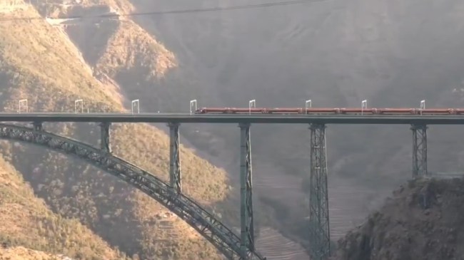 #WATCH | Jammu and Kashmir: Visuals of Vande Bharat train crossing the world’s highest railway bridge Chenab Rail Bridge
