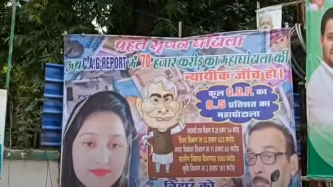पोस्टर में लिखा है पहले सृजन घोटाला और अब कैग रिपोर्ट में 70 हजार करोड़ के महाघोटाले की न्यायिक जांच हो। इसके आगे लिखा है कुल जीडीपी का 8.5 प्रतिशत का महाघोटाला। पोस्टर में सीएम का फोटो लगा है। इसके अलावा पटना में और भी कई जगह पर सीएम नीतीश पर निशाना साधते पोस्टर शेयर किए हैं। वीडियो के जरिए जानें पूरा मामला…