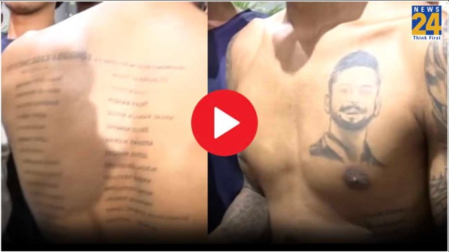दरअसल विराट के इस जबरे फैन ने अपने पूरे शरीर पर टैटू बनावा रखे थे। अपनी छाती पर इस फैन ने विराट कोहली का फोटो बनवा रखा था। इसके अलावा अपनी पीठ पर टीम इंडिया के कुछ पूर्व और कुछ मौजूदा खिलाड़ियों के नाम भी लिखवा रखे थे। इस फैन से जब न्यूज 24 के रिपोर्टर ने बातचीत की तो उसने बताया कि विराट कोहली उसके लिए इमोशन हैं।