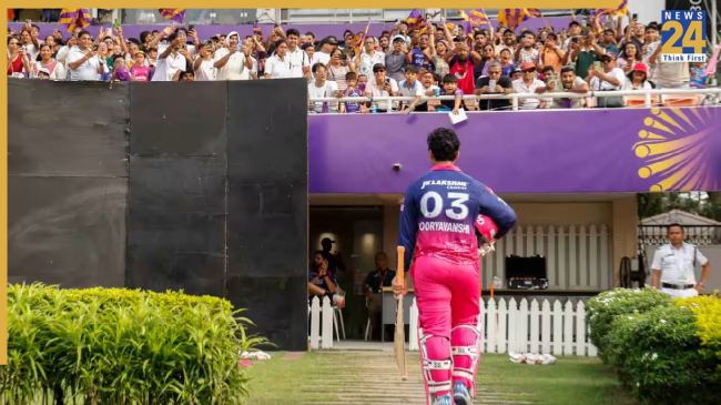 15 वर्षीय युवा स्टार वैभव सूर्यवंशी ने 28 गेंदों में 46 रनों की शानदार पारी खेली. जिसमें उन्होंने 6 चौके और 2 गगनचुंबी छक्के जड़े. सूर्यवंशी जब अपना अर्धशतक पूरा करने वाले थे. उस समय वो वरुण चक्रवर्ती की गेंद पर बड़ा शॉट खेलने गए. जहां पर रमनदीप सिंह ने उनका बाउंड्री पर कैच पकड़ा. खराब शॉट खेलकर आउट होने के कारण सूर्यवंशी अपने आप से ही बहुत ही ज्यादा नाराज आए. जिसके कारण ही पवेलियन लौटते समय उन्होंने 2 बार अपना बल्ला जमीन पर पटका. जिसके बारे में अब सोशल मीडिया पर बहुत ज्यादा चर्चा होने लगी है.