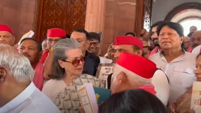 अखिलेश यादव ने सोनिया गांधी से बातचीत करते हुए कहा कि संविधान की बुक के बारे में बात की । उन्होंने कहा कि ये हैं अयोध्या के नए सांसद अवधेश प्रसाद सिंह। इस दौरान वे उनका नाम नहीं लेते हैं लेकिन हाथों से अवधेश प्रसाद सिंह की ओर इशारा कर देते हैं। इस पूरे वाक्ये को न्यूज 24 के कैमरापर्सन ने अपने कैमरे में कैद किया। देखें ये पूरा वीडियो…