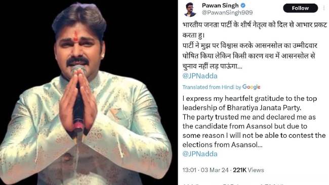 Pawan singh to contest from asansol: बीजेपी की तरफ से जारी पहली लिस्ट में भोजपुरी पावर स्टार पवन सिंह का भी नाम शामिल था। पवन सिंह को आसनसोल से टिकट मिला था, लेकिन उन्होंने वहां से चुनाव लड़ने से इनकार कर दिया। पवन सिंह के ऐसा करने के पीछे कई वजहें बताई जा रही हैं। जानकारों का कहना है कि ऐसा उन्होंने इसलिए किया क्योंकि वो अपने घर आरा से चुनाव लड़ना चाहते थे।