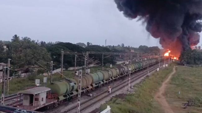 Goods Train Massive Fire Video: तमिलनाडु में आज चेन्नई-अरक्कोणम रेलवे ट्रैक से डीजल से भरी मालगाड़ी उतर गई और उसमें भयानक आग लग गई। आग इतनी विकराल थी कि ऊंची-ऊंची लपटें देखकर लोग सहम गए। आसमान काले धुएं से भर गया। चेन्नई पोर्ट से निकली मालगाड़ी के 4 डिब्बे पटरी से उतर गए थे, लेकिन भड़की आग ने पूरी ट्रेन को चपेट में ले लिया था। हादसा तिरुवल्लूर जिले में एगट्टूर गांव के पास अलसुबह करीब 5 बजे हुआ था। हादसे की जानकारी मिलते ही लोकल पुलिस, फायर ब्रिगेड, RPF, नजदीकी स्टेशन मास्टर और रेलवे अधिकारी मौके पर पहुंचे।