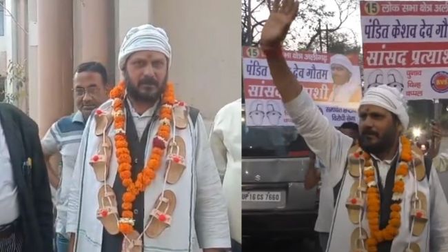 Aligarh Viral Video: लोकसभा चुनाव को लेकर उत्तर प्रदेश में सियासी पारा चढ़ा हुआ है। चुनाव जीतने के लिए नेता और पार्टी हर संभव कोशिश कर रहे हैं। अब लोकसभा प्रत्याशी का वीडियो वायरल हो रहा है जिसमें वह चप्पल की माला पहनकर वोट मांग रहे हैं। मामला अलीगढ़ का है और प्रत्याशी का नाम है पंडित केशव देव गौतम।