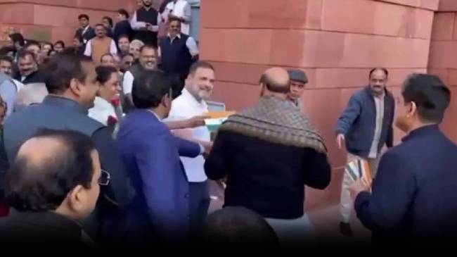 Rahul Gandhi gives Rose and Tiranga to Rajnath Singh: संसद का शीतकालीन सत्र लगातार सुर्खियां बटोर रहा है। अडानी मुद्दे को लेकर विपक्ष लगातार सदन के बाहर आवाज उठा रहा है। इसी कड़ी में आज यानी 11 नवंबर को सदन की कार्यवाही शुरू होने से पहले एक गजब का नजारा देखने को मिला। कांग्रेस पार्टी के सारे सांसद हाथ में गुलाब का फूल और तिरंगा लेकर खड़े दिखाई दिए। सभी सांसद सत्ता पक्ष के नेताओं को तिरंगा और गुलाब का फूल देते नजर आ रहे थे।