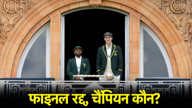 WTC 2025 Final: वर्ल्ड टेस्ट चैंपियनशिप 2025 का फाइनल मुकाबला 11 जून से ऑस्ट्रेलिया और साउथ अफ्रीका के बीच लॉर्ड्स में खेला जाएगा। साउथ अफ्रीका पहली बार फाइनल में पहुंची है ऐसे में उसके पास टेम्बा बावुमा की कप्तानी में पहली बार चैंपियन बनने का सुनहरा मौका है। वहीं अब डब्ल्यूटीसी फाइनल पर बारिश का साया मंडरा रहा है, ऐसे में अब बड़ा सवाल ये उठ रहा है कि अगर बारिश के चलते फाइनल रद्द हो जाता है तो कौनसी टीम के पास ट्रॉफी जाएगी?