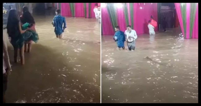 शादी के दौरान अचानक बारिश होने लगी। बारिश इतनी तेज़ थी कि शादी का हॉल सचमुच जलमग्न हो गया। मांडवा में पानी जमा हो गया और स्विमिंग पूल जैसा बन गया। लेकिन दूल्हा पीछे नहीं हटा। इसके विपरीत, उन्हें कमर तक पानी में घुसकर खाना खाते हुए देखा जाता है। इस वीडियो को देखने के बाद लोग कह रहे हैं। एक बार बाढ़ भी आ जाए तो चलेगा, लेकिन भोजन खत्म नहीं होना चाहिए। इस वीडियो को देखने के बाद अब आप खुद ही बताएं कि आप ऐसे लोगों को क्या कहते हैं?