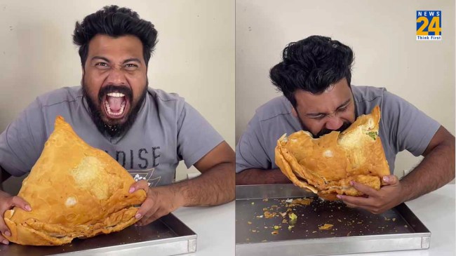 Young Man Tried To Eat 5 kg Samosa : सोशल मीडिया पर एक वीडियो बहुत तेजी से वायरल हो रहा है, जिसमें एक युवक को 5 किलो का समोसा खाते हुए देखा जा सकता है। यह वीडियो इंस्टाग्राम पर फूड ब्लॉगर @sagar_sankpal95 द्वारा शेयर किया गया, इस वीडियो ने सोशल मीडिया पर तूफान खड़ा कर दिया है, इस वीडियो को अब तक 95 हजार से अधिक लाइक्स मिल चुके हैं। वायरल वीडियो के सेक्शन में देखा जा सकता है कि लोग कमेंट बॉक्स में युवक को बाहुबली बता रहे हैं। वीडियो में शख्स अपनी पूरी जान लगाकर समोसा खा रहा है।