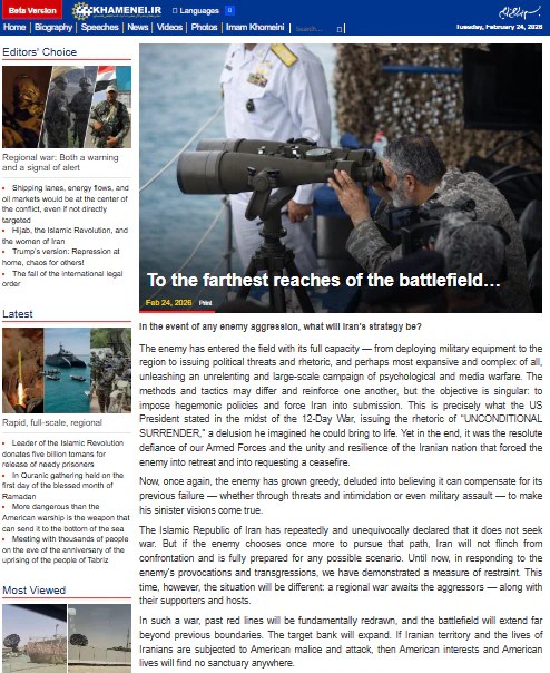 english.khamener.ir рдкрд░ рдПрдХ рдИрд░рд╛рдиреА рдЕрдЦрдмрд╛рд░ рдХрд╛ рдЖрд░реНрдЯрд┐рдХрд▓ рд╢реЗрдпрд░ рдХрд┐рдпрд╛ рдЧрдпрд╛ рд╣реИ. рд╡реЗрдмрд╕рд╛рдЗрдЯ рдкрд░ рдЗрд╕ рдЖрд░реНрдЯрд┐рдХрд▓ рдХреЛ рдЕрдкрд▓реЛрдб рдХрд░рддреЗ рд╣реБрдП рд╢реАрд░реНрд╖рдХ рдореЗрдВ рд▓рд┐рдЦрд╛ рдЧрдпрд╛ рд╣реИ, ‘рджреБрд╢реНрдорди рдХреЗ рд╣рдорд▓реЗ рдХреА рд╕реНрдерд┐рддрд┐ рдореЗрдВ рдИрд░рд╛рди рдХреА рд░рдгрдиреАрддрд┐ рдХреНрдпрд╛ рд╣реЛрдЧреА?’